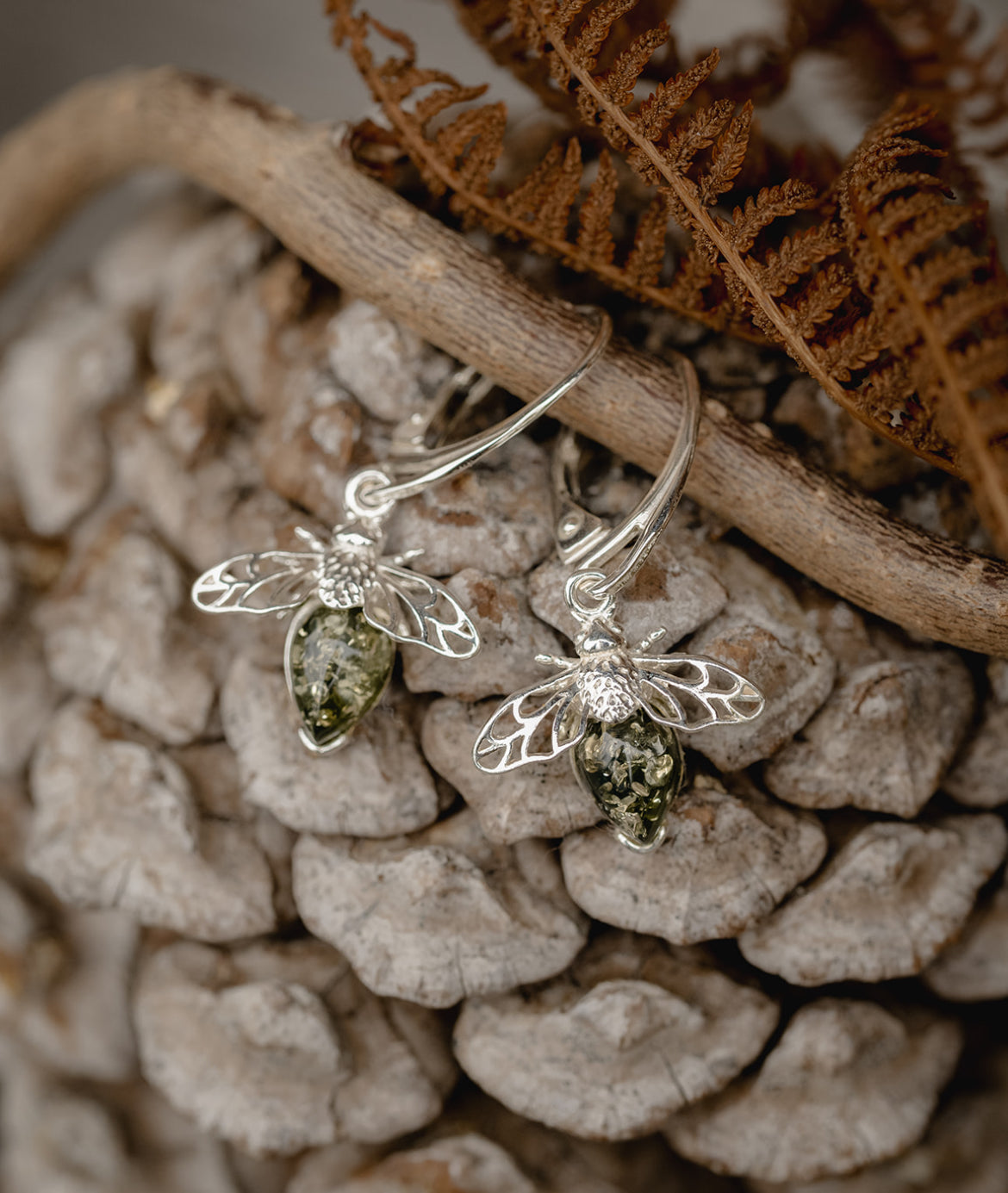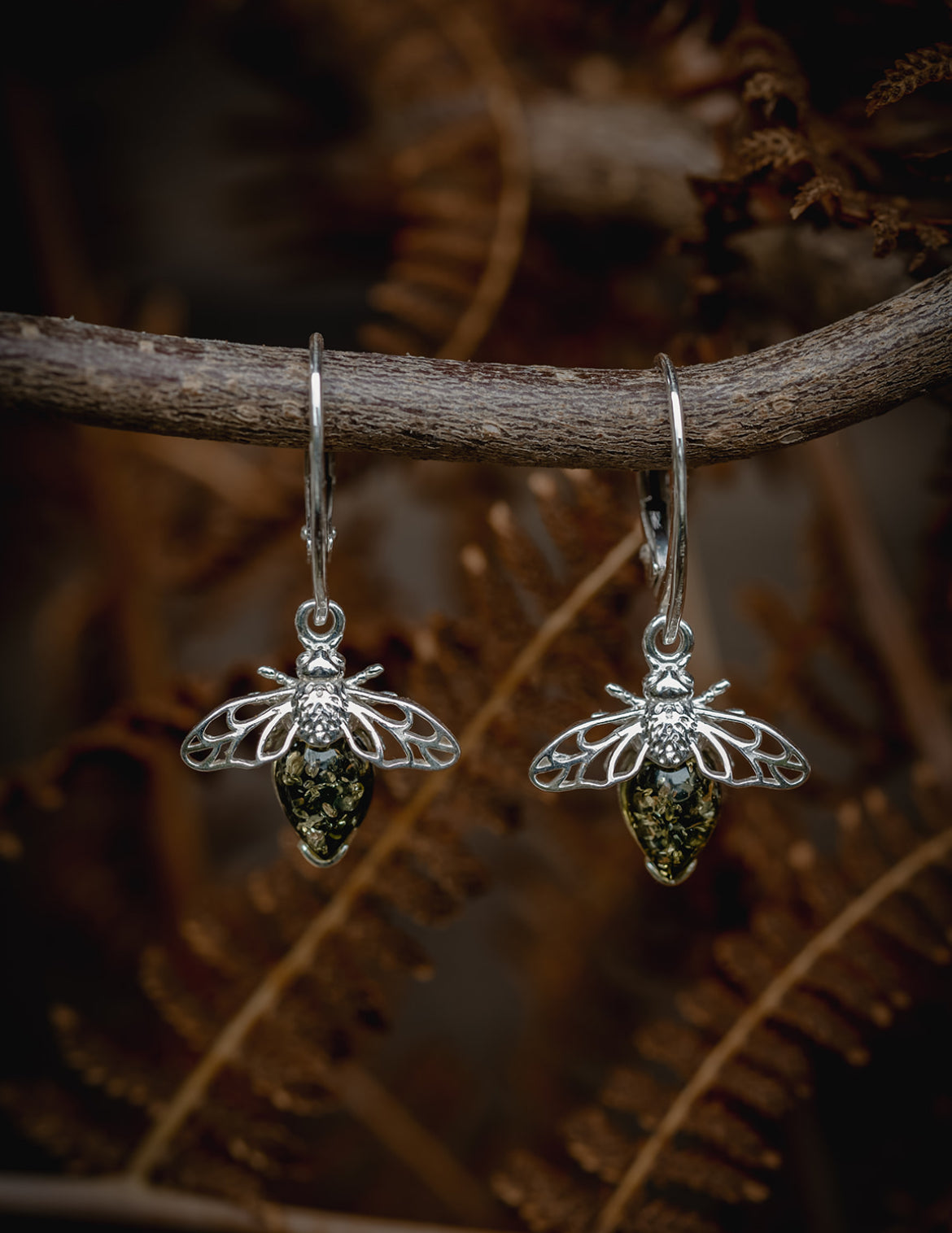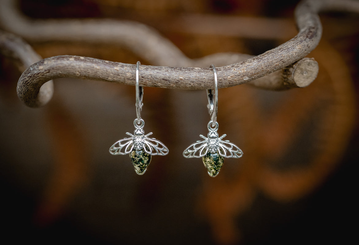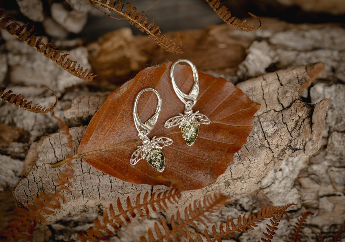 Die kleinen Bienenanhänger sind aus 925 Sterling-Silber gefertigt und mit einem leuchtend grünen Bernstein versehen, der als Rumpf dezent schimmert.