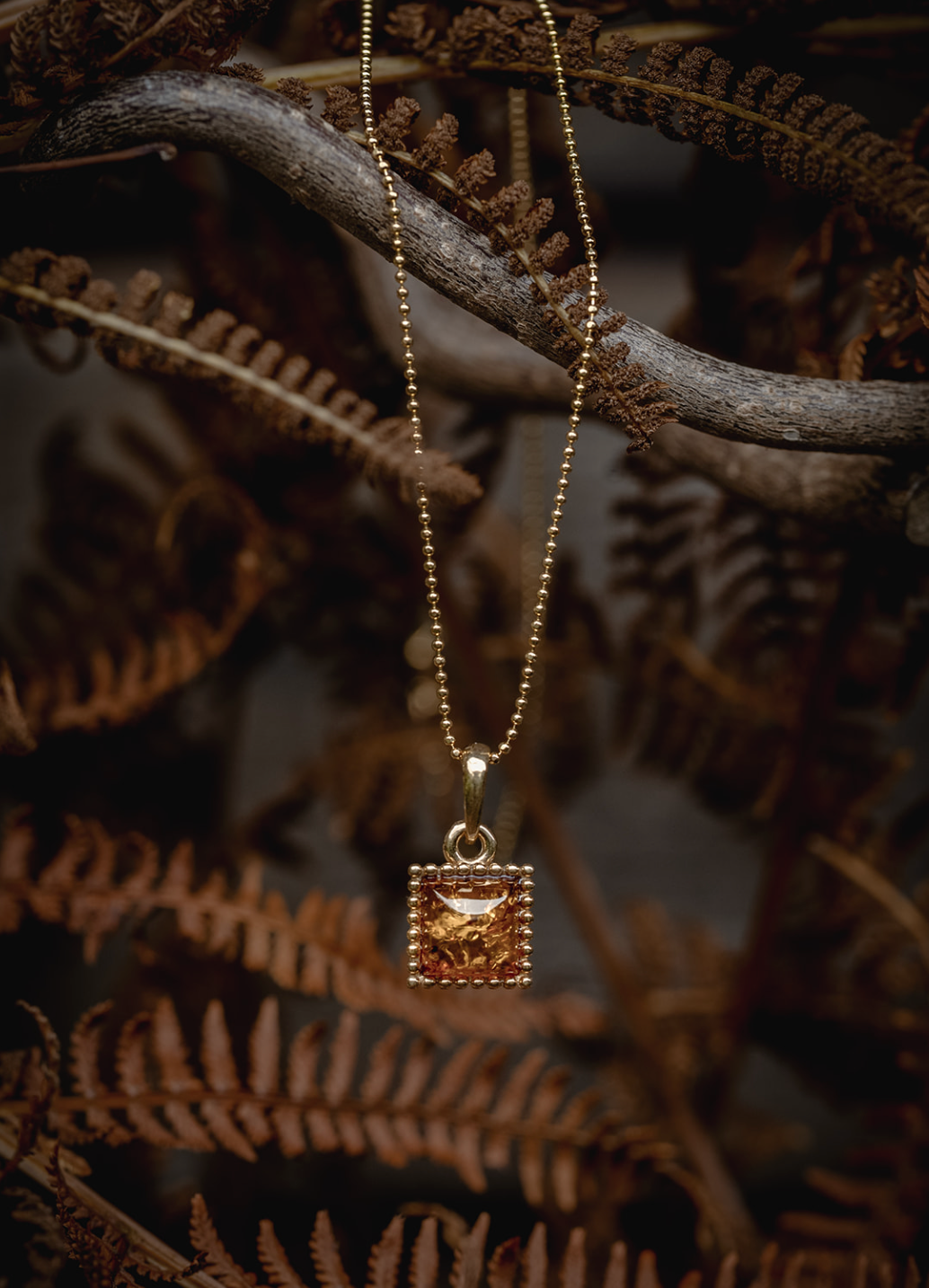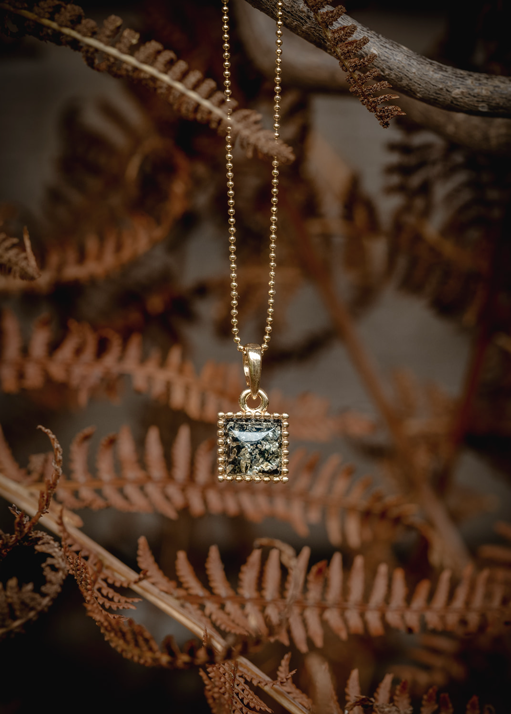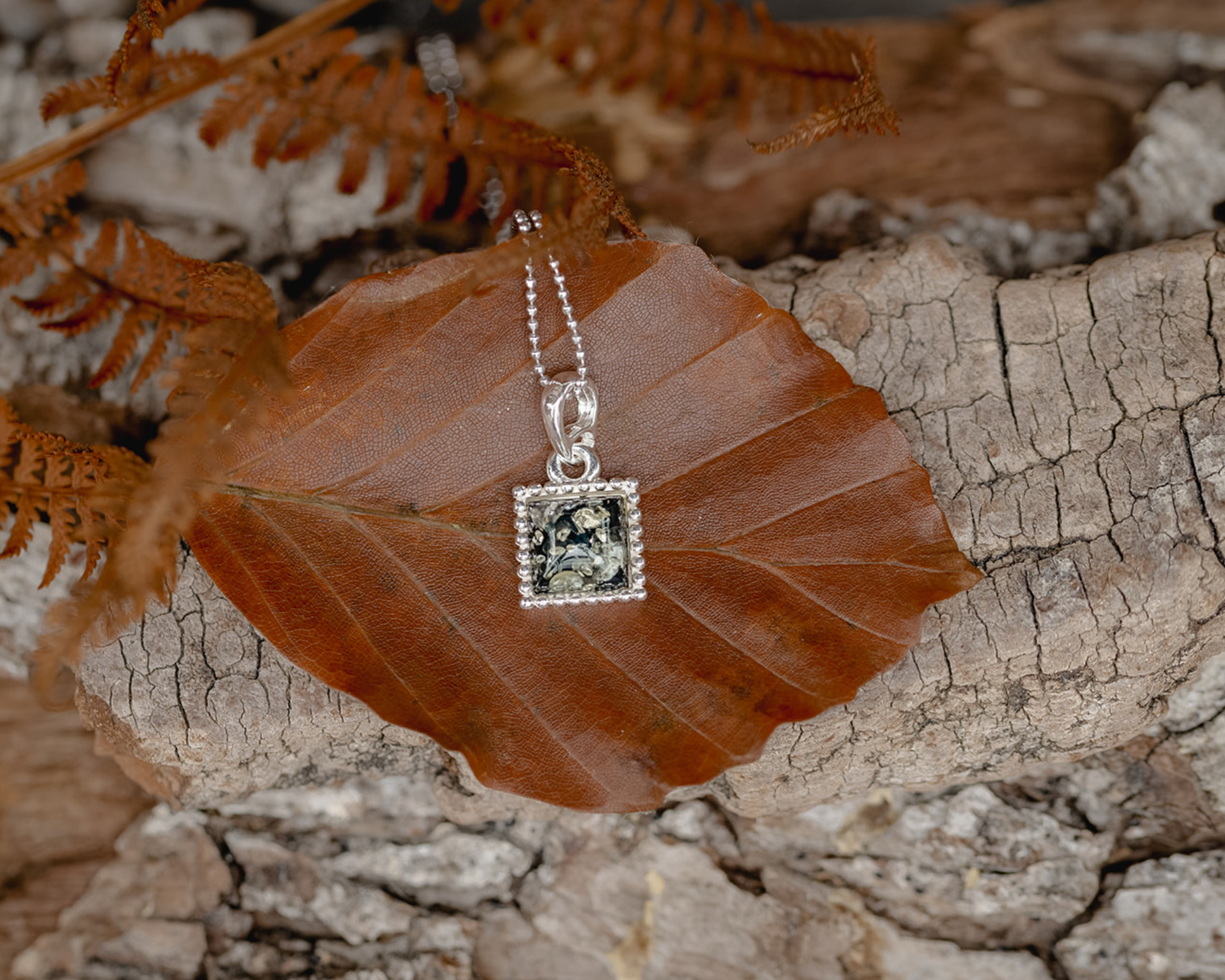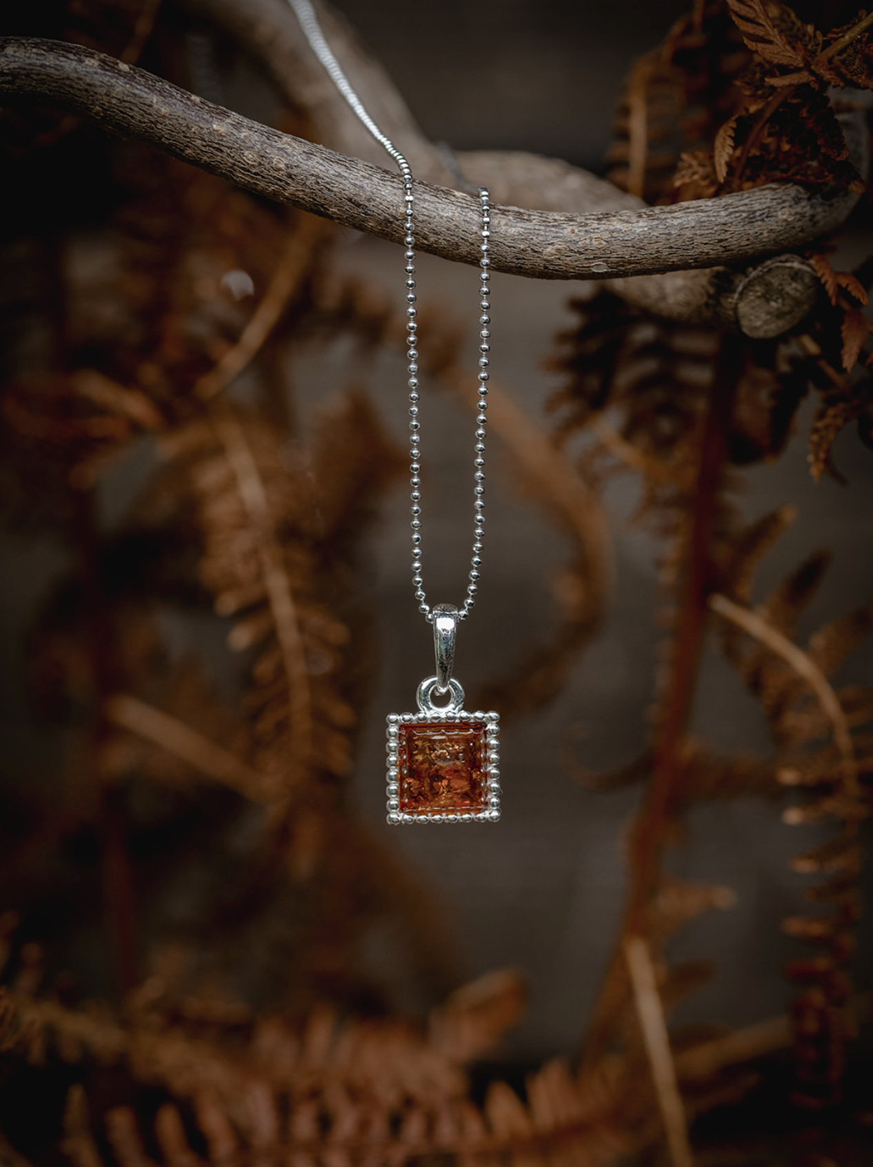 Dieser quadratische Bernsteinanhänger mit Kugelkette vereint klare Formen mit feinen Details. Der 1x1 cm große Bernstein - wahlweise in warmen Cognac oder elegantem Grün - wird von einer filigranen Perlstruktur eingefasst, die wie kleine Silberkörner den Stein umarmt.