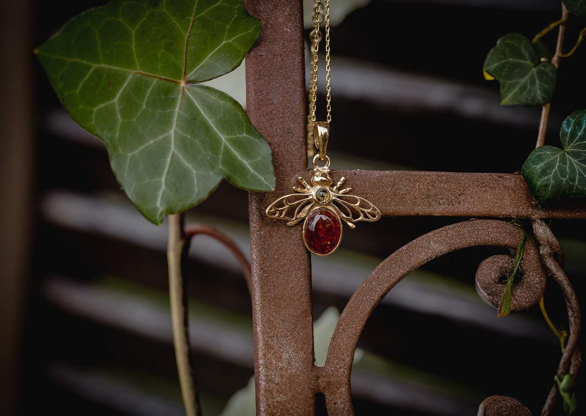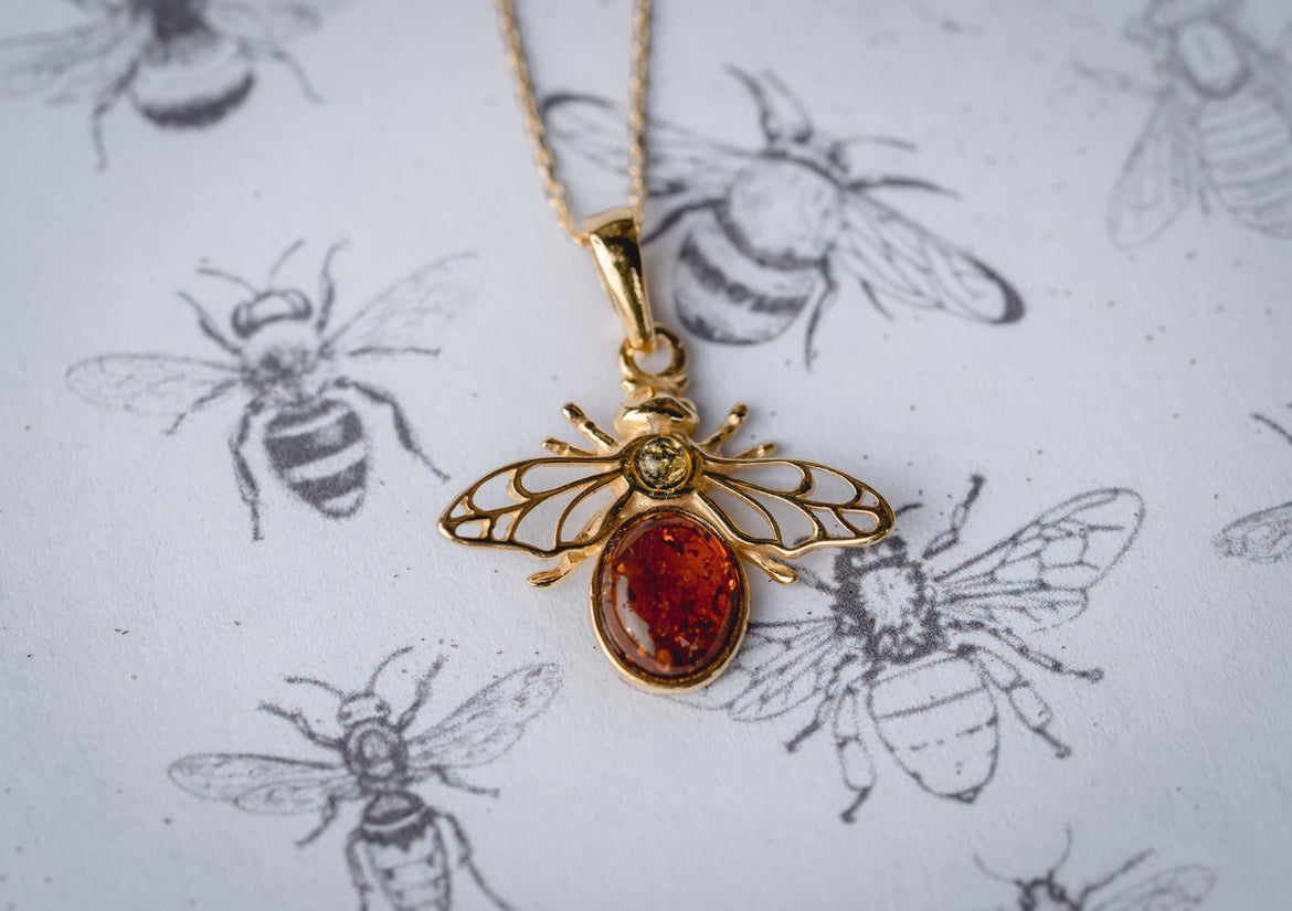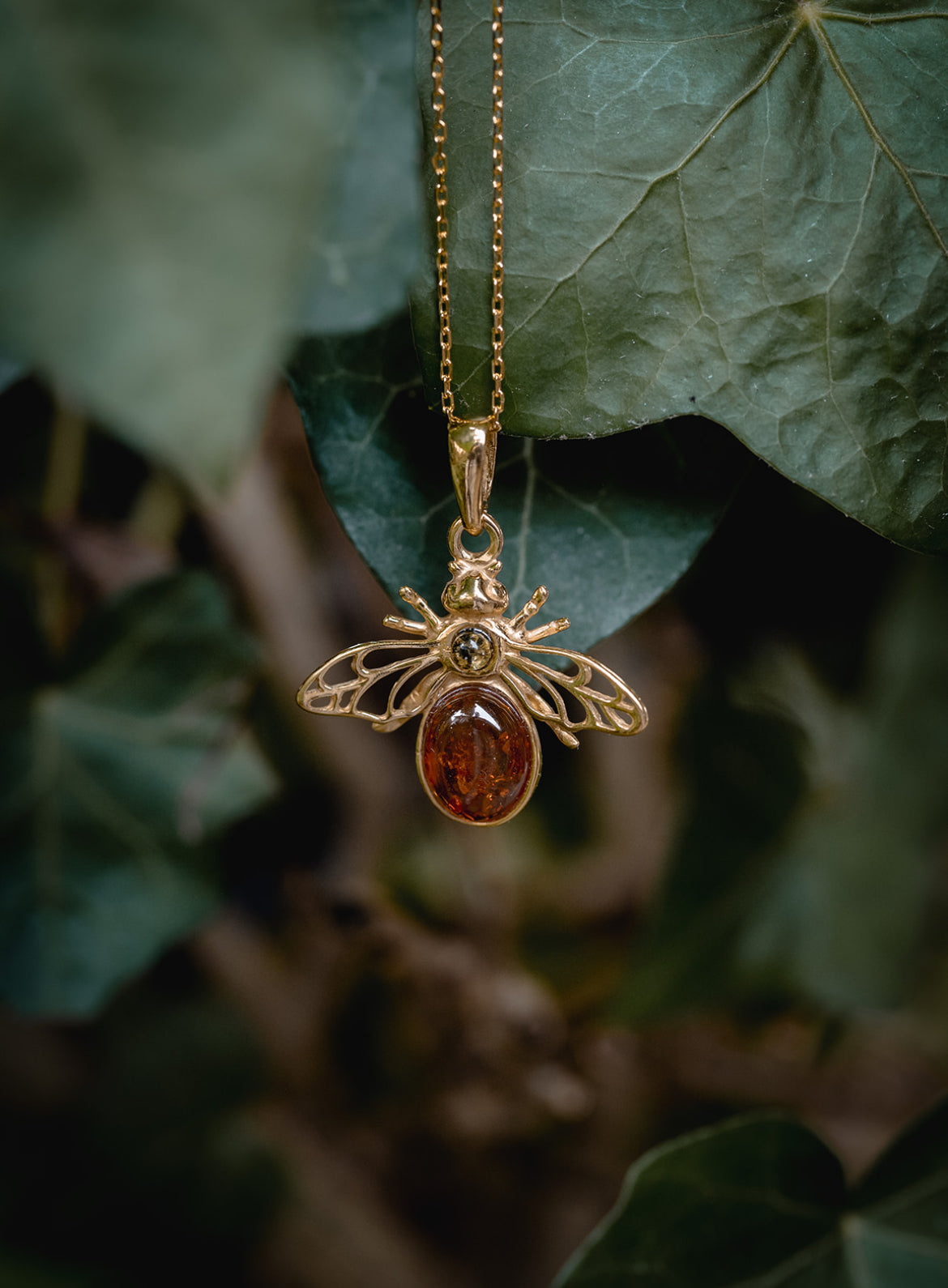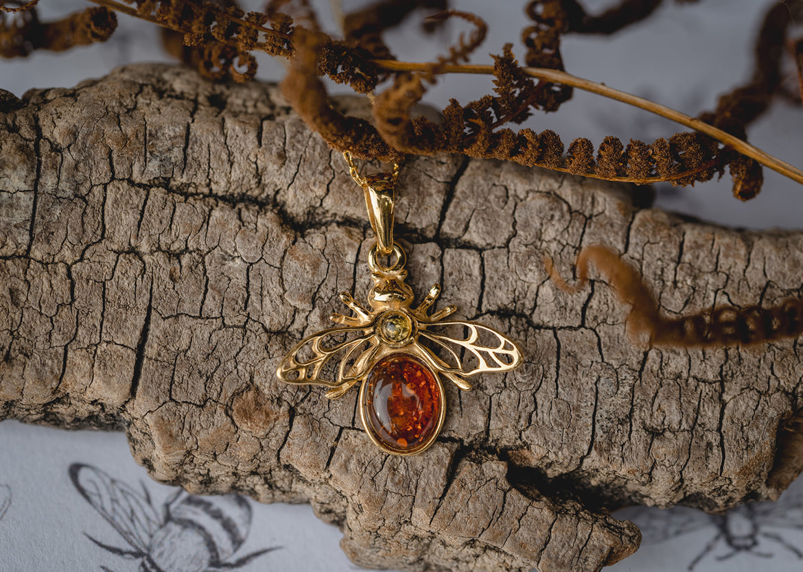 Der Rumpf der Biene wird aus zwei echten Bernsteinsteinen gefertigt: